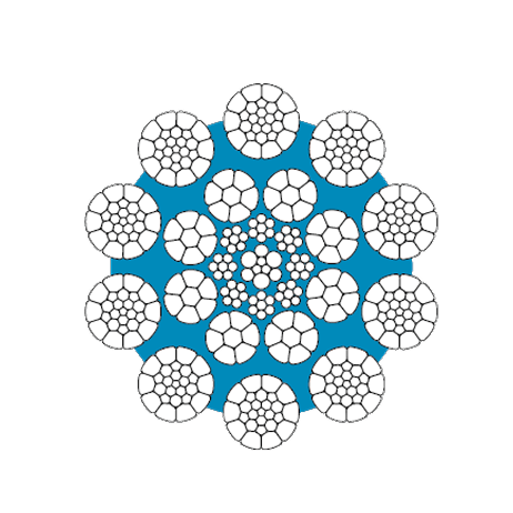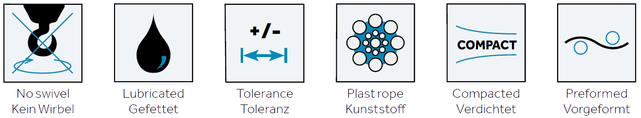Carga de ruptura muito elevada e boa resistência contra esmagamento. Cabo para elevação em enrolamentos com múltiplas camadas para menores alturas de elevação, bem como para os sistemas de elevação duplo com cabos de torção esquerda e direita para maiores alturas de elevação.