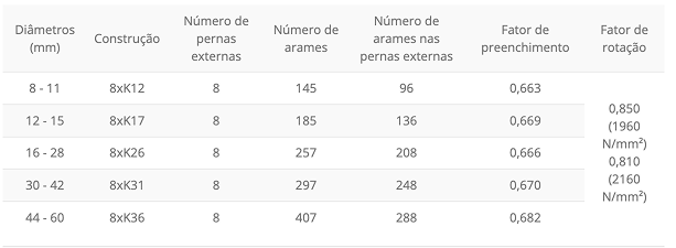 | Diâmetro nominal | Área metálica | Peso | Carga mínima de ruptura | |||